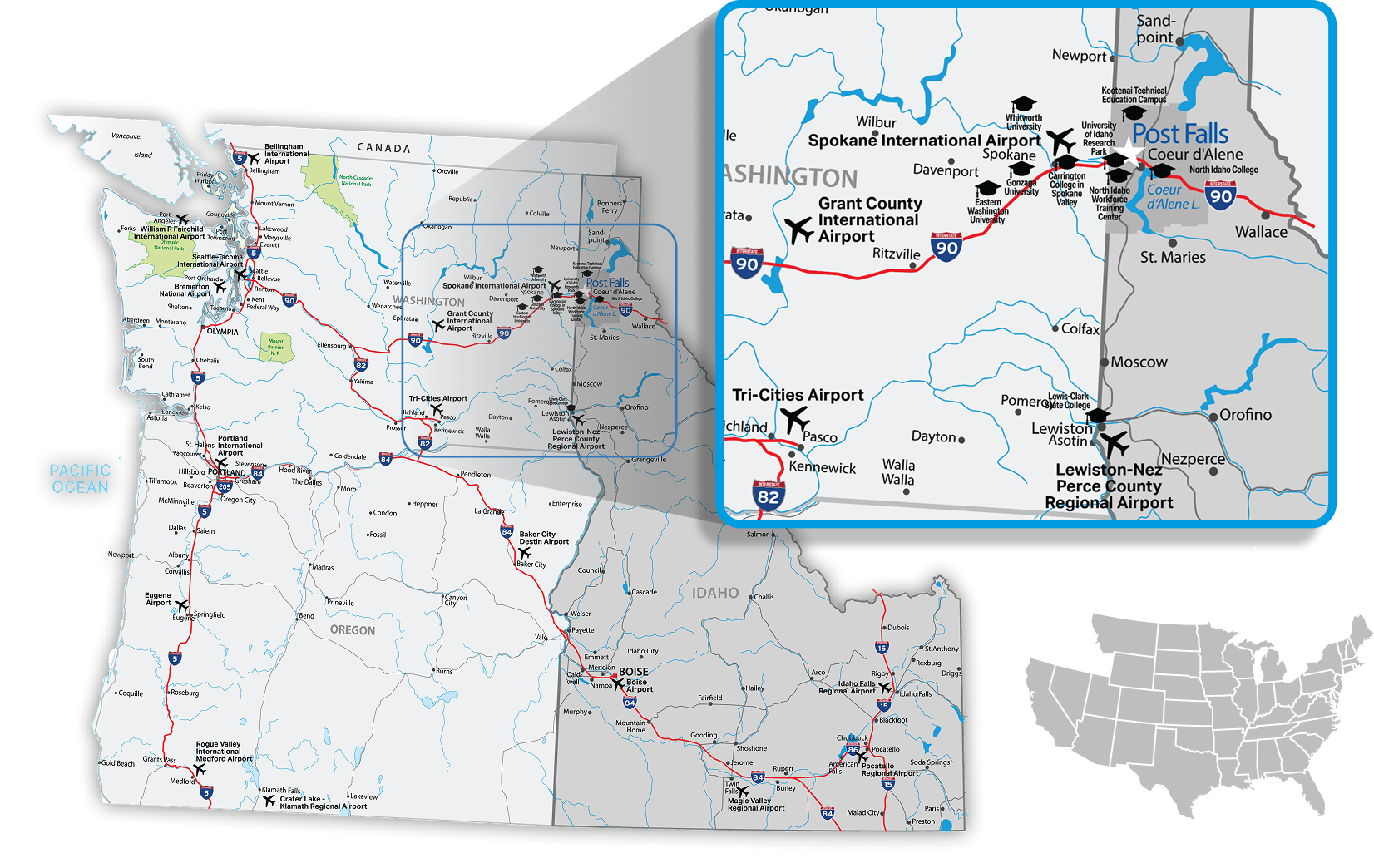 Post Falls is at the center of a bevy of education options, including North Idaho College in neighboring Coeur d'Alene and Gonzaga University in Spokane.